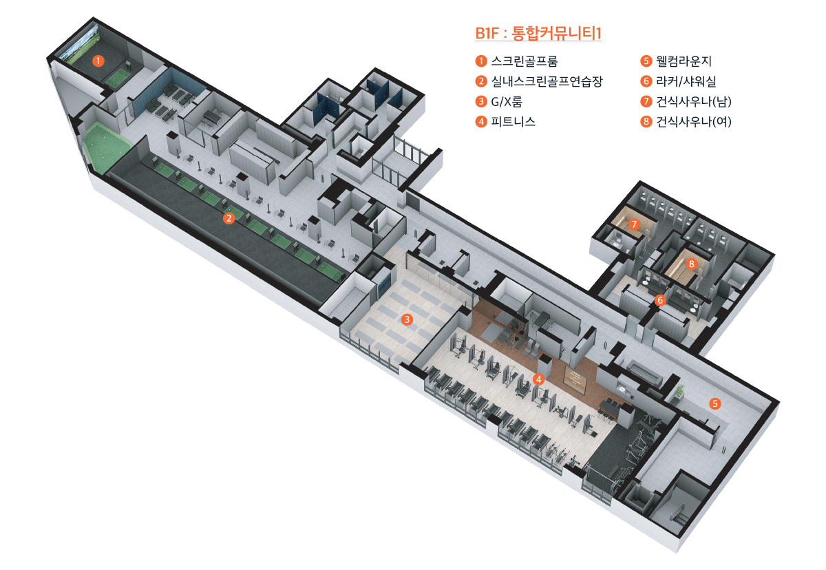 단지 내 피트니스, 실내 스크린골프연습장, 개인 오피스, 그린카페 등 입주민의 품격을 높여주는 커뮤니티센터.