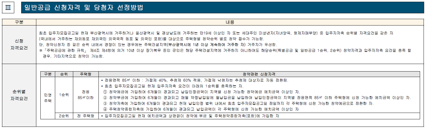 단, 청약신청자 중 같은 순위 내에서 경쟁이 있는 경우에는 주택건설지역(부산광역시에 1년 이상 계속하여 거주한 자) 거주자가 우선함.